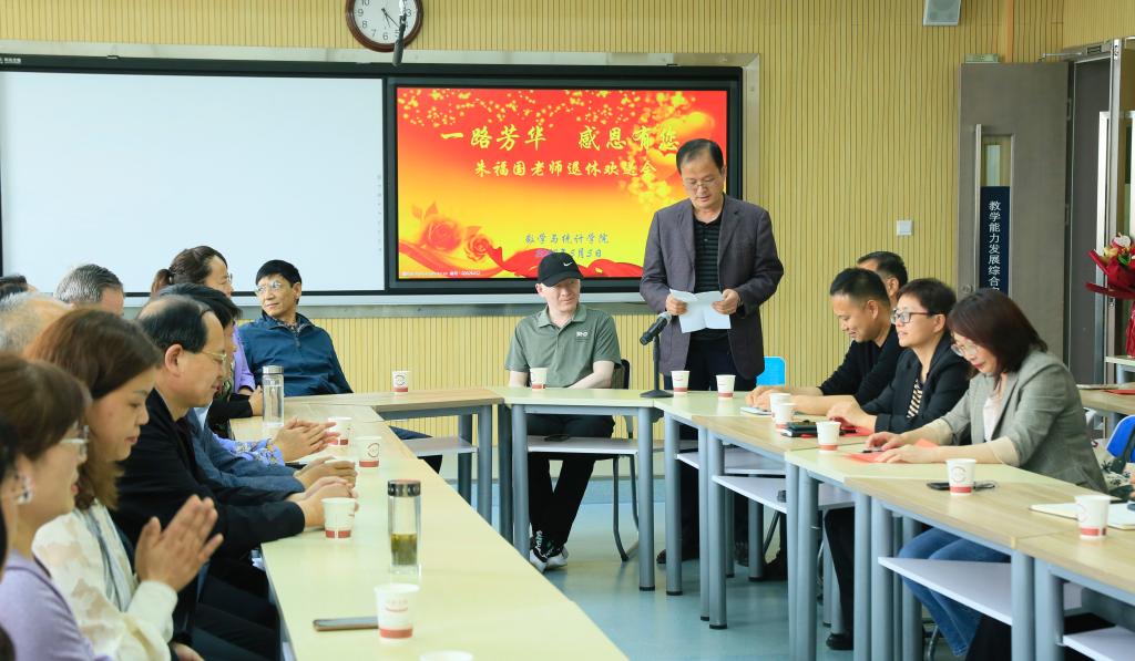 在欢送会上,朱福国教授上了退休前的最后一堂课。学院党委负责人代表学院对朱福国教授在教书育人岗位上42年辛勤耕耘取得的成绩进行了总结,对朱福国教授在教学科研工作中的治学严谨、一丝不苟精神,在学生教育中的爱生如子、诲人不倦作风和积极发挥老教师传帮带、老党员先锋模范作用上给予了充分肯定和高度评价,并为朱老师送上美好祝愿,同时希望朱老师一如既往地关心关注学院的发展,以积极乐观的心态迎接全新的退休生活。